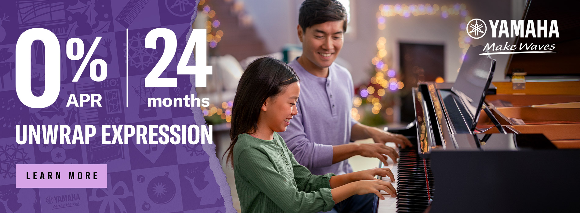*Subject to credit approval. 24 monthly payments of $41.67 per $1,000 financed at 0.00% APR. On purchases of new and in-stock qualifying Yamaha pianos from October 30, 2025 to January 5, 2026.
