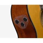 The battery box is integrated into the end-pin jack, requiring fewer holes in the body and thus reducing acoustic sound loss. Connect a cable from the jack to a PA or amp to use the TA instrument as an acoustic-electric guitar.