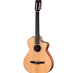 The 112ce-N is our first 100 Series nylon-string cutaway Grand Concert, blending the warm, snappy sound of nylon strings with a comfortable, compact body shape. It offers an outstanding value for players of all skill levels. Featuring a solid, torrefied spruce top paired with layered sapele back and sides, this acoustic-electric offers a clear, balanced voice ideal for fingerstyle players and light strumming. Its 12-fret neck and 1-7/8-inch nut width (narrower than a traditional classical guitar neck) make it easy to play, especially for those transitioning from steel-string guitars. A specialized voicing architecture is designed to enhance the natural warmth and clarity of the nylon strings, providing a well-balanced and responsive tone. Equipped with onboard ES-N electronics, the 112ce-N offers reliable amplified sound for studio settings and stage performances. Its matte-finished body features black binding and a 3-ring rosette. The ebony fretboard is inlaid with 4mm Dots in Italian acrylic and the slotted peghead is outfitted with classical nickel tuners. This model comes in a soft gig bag. It’s a great option for players who crave the comfort of a small-bodied guitar, signature Taylor playability and rich nylon flavors at an accessible price point.