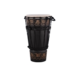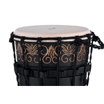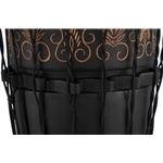 Pearl's Rope Tuned Wood Ashiko features a beautiful hand-carved decorative finish. The origin of Ashiko drums can be traced back to West Africa and the Yoruba tribe. The Ashiko is a close relative to the djembe and its sound is complementary to the djembe when played together in drum circles or ensembles. The long tapered cylinder of the Ashiko produces lower bass notes than djembes, with rich mid-tones. Carved from a solid Mahogany log, the Pearl Ashiko is 22" tall and features a 12" goat skin head. 14 EZ Twist Rope Tuners are attached, allowing you to raise the drum's pitch quickly.