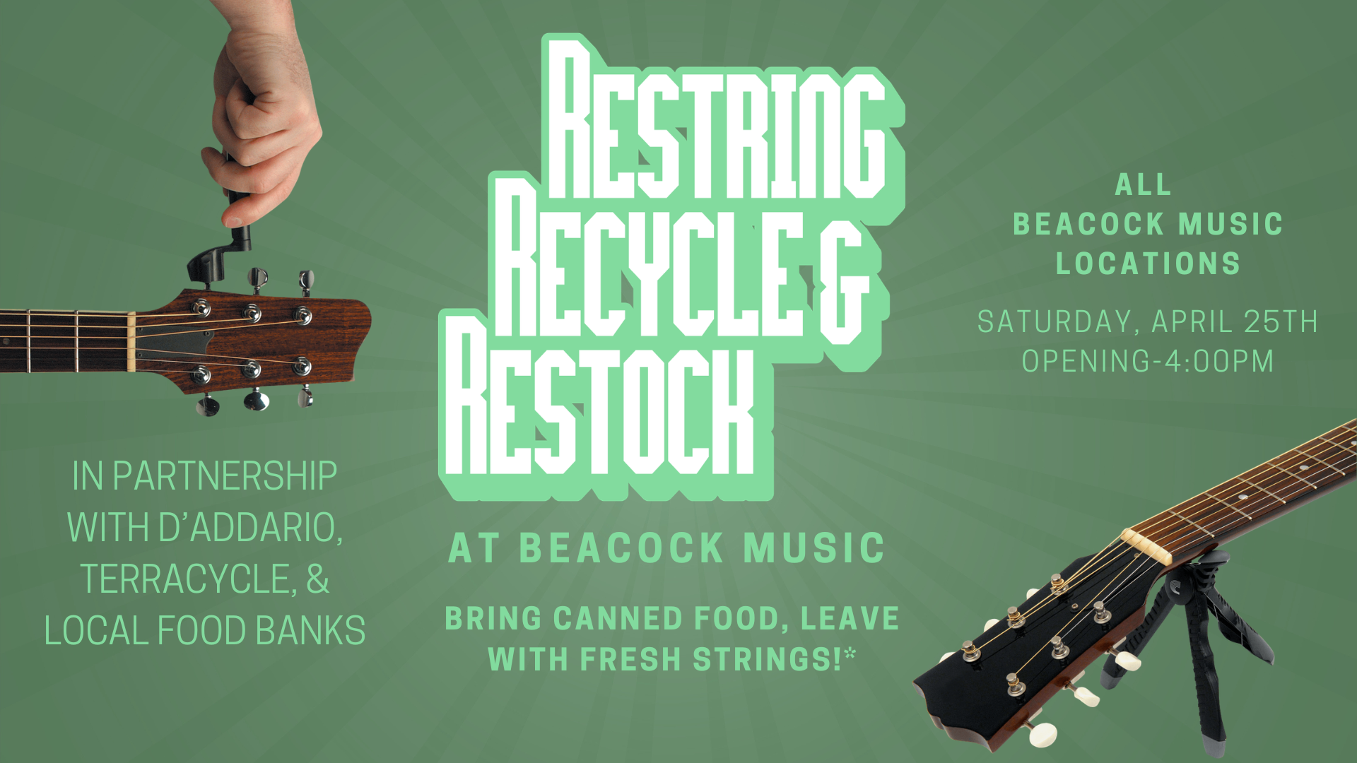 Restring: Bring in an acoustic guitar, electric guitar, or bass guitar on this day and we will restring it for FREE!