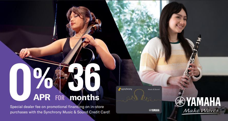 *On qualifying in-store purchases of select Yamaha wind or string instruments in the amount of $1,799 or more from 4/01/2026-6/30/2026. Equal monthly payments required for 36 months. Participating, authorized retailers only. Offer applies only to single-receipt qualifying purchases. No interest will be charged, and equal monthly payments are required on promo purchase until it is paid in full. The payments equal the initial total promo purchase amount divided by the number of months in the promo period, rounded up to the next whole dollar. These payments may be higher than the payments that would be required if this purchase was a non-promo purchase. During the last month(s) of the promo period the required monthly payment may be reduced due to the prior months’ rounding. Regular account terms apply to non-promo purchases. New Accounts as of 07/31/2025: Purchase APR is 34.99%. Penalty APR is 39.99%. Min Interest Charge is $2. Existing cardholders: See your credit card agreement terms. Subject to credit approval.